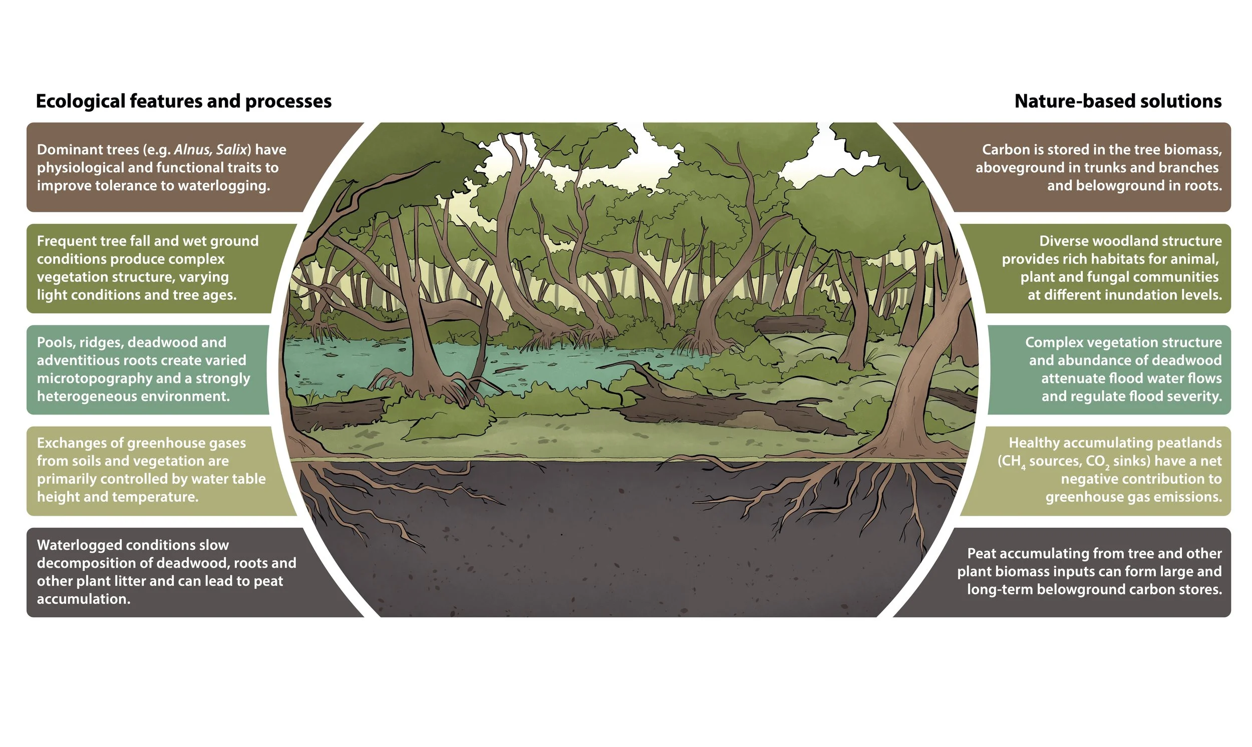 You can read more about peat-forming wet woodlands and the nature-based solutions they provide in this publication. It is co-written by experts in academia and UK Government as part of the Wet Woodland Research Network. The report highlights critical knowledge gaps in our understanding of peat-forming wet woodlands that, once addressed, could form the basis for their inclusion in net zero and land-use policies.